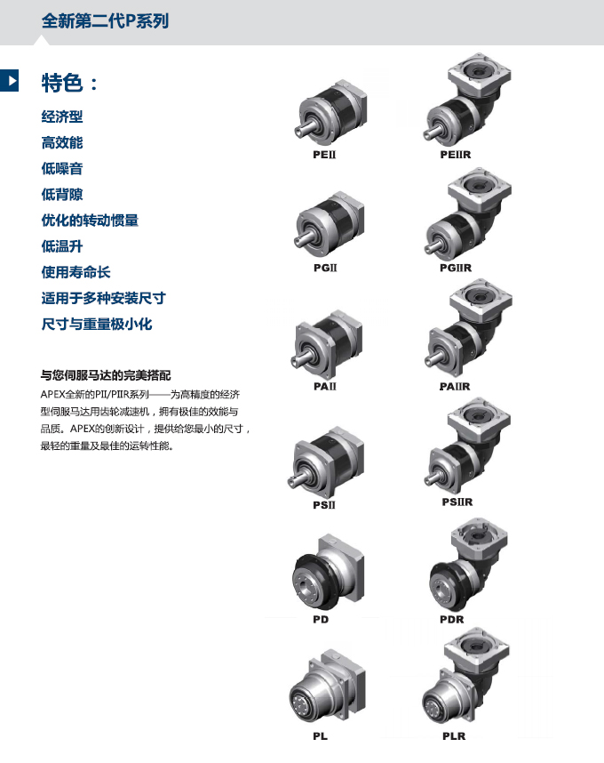 經(jīng)濟(jì)型 高效能 低噪音 低背隙 優(yōu)化的轉(zhuǎn)動(dòng)慣量 低溫升 適用于多種安裝尺寸 尺寸重量極小化
