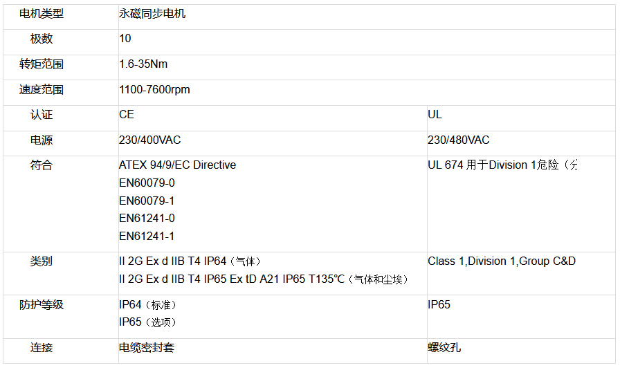 EX系列是設計適用于易燃氣體環境的一系列永磁同步伺服電機,可用于II 2GD Ex d IIB T4 IP65 Ex tD A21 IP65 T135°C(氣體和塵埃)的工況。