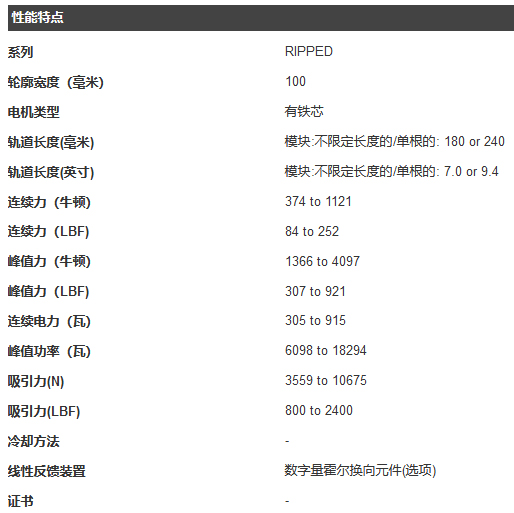 派克 R10 RIPPED 有鐵芯直線電機,其抗齒槽力技術,生產(chǎn)許多工業(yè)應用所需的大推力 - 避免了傳統(tǒng)有鐵芯直線電機齒槽力帶來的粗糙度. 持續(xù)推力范圍 374 N (84 lbf) up to 1121 N (252 lbf) ,峰值推力范圍 1366 N (307 lbf) up to 4097 N (921 lbf), RIPPED系列是非常適合廣泛的極端苛刻的應用。派克提供了模塊化的磁軌實現(xiàn)無長度限制的行程。電機連接器模塊可以輕松快捷的安裝,同時降低總體維護成本。超高柔性電纜為標準配置。幾乎接近于無鐵芯電機的零齒槽力使RIPPED系列堪稱高推力和極其平滑運動的首選。