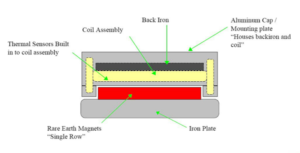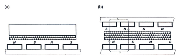 下圖表示的是典型的平板直線電機的結構。圖中的灰色的部分是底板, 黃色的方塊為一塊塊的永磁體,黃色和灰色部分組成了直線電機的定子。相 鄰兩個永磁體的極性是相反的,所以磁力線的分布如圖中所示。黃色的點表 示次級線圈中導線的橫截面。